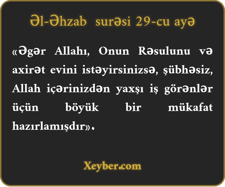 «Əgər Allahı, Onun Rəsulunu və axirət evini istəyirsinizsə, şübhəsiz, Allah içərinizdən yaxşı iş görənlər üçün böyük bir mükafat hazırlamışdır».