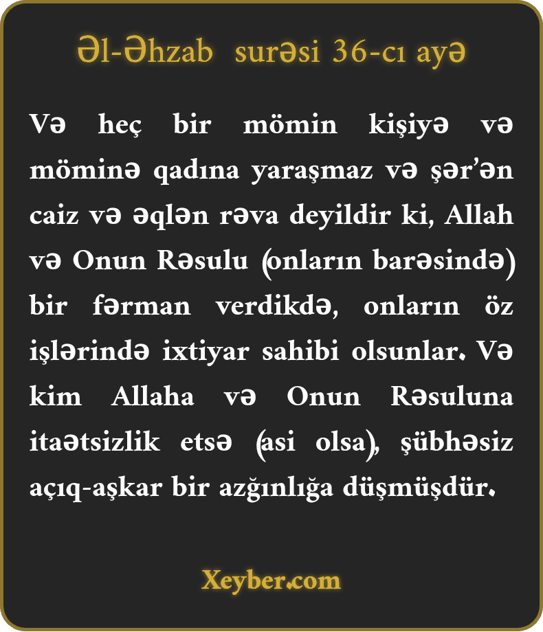 Və heç bir mömin kişiyə və möminə qadına yaraşmaz və şər’ən caiz və əqlən rəva deyildir ki, Allah və Onun Rəsulu (onların barəsində) bir fərman verdikdə, onların öz işlərində ixtiyar sahibi olsunlar. Və kim Allaha və Onun Rəsuluna itaətsizlik etsə (asi olsa), şübhəsiz açıq-aşkar bir azğınlığa düşmüşdür.