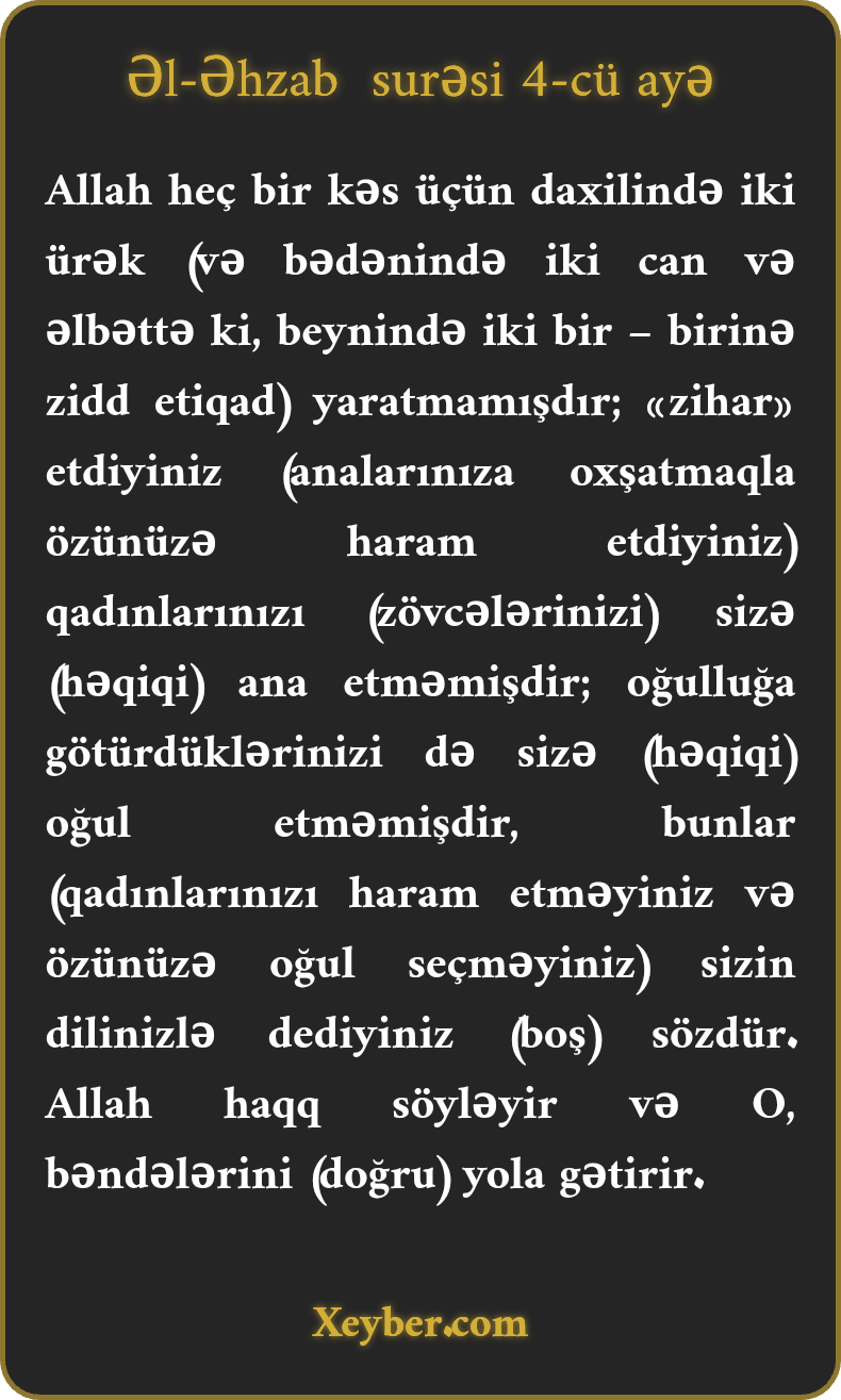Allah heç bir kəs üçün daxilində iki ürək (və bədənində iki can və əlbəttə ki, beynində iki bir – birinə zidd etiqad) yaratmamışdır; «zihar» etdiyiniz (analarınıza oxşatmaqla özünüzə haram etdiyiniz) qadınlarınızı (zövcələrinizi) sizə (həqiqi) ana etməmişdir; oğulluğa götürdüklərinizi də sizə (həqiqi) oğul etməmişdir, bunlar (qadınlarınızı haram etməyiniz və özünüzə oğul seçməyiniz) sizin dilinizlə dediyiniz (boş) sözdür. Allah haqq söyləyir və O, bəndələrini (doğru) yola gətirir.