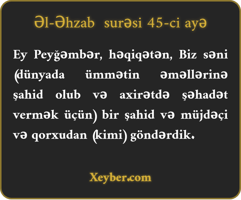 Ey Peyğəmbər, həqiqətən, Biz səni (dünyada ümmətin əməllərinə şahid olub və axirətdə şəhadət vermək üçün) bir şahid və müjdəçi və qorxudan (kimi) göndərdik.