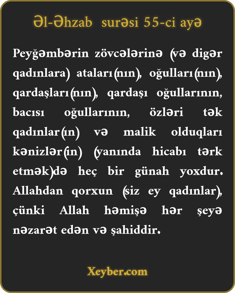Peyğəmbərin zövcələrinə (və digər qadınlara) ataları(nın), oğulları(nın), qardaşları(nın), qardaşı oğullarının, bacısı oğullarının, özləri tək qadınlar(ın) və malik olduqları kənizlər(in) (yanında hicabı tərk etmək)də heç bir günah yoxdur. Allahdan qorxun (siz ey qadınlar), çünki Allah həmişə hər şeyə nəzarət edən və şahiddir.