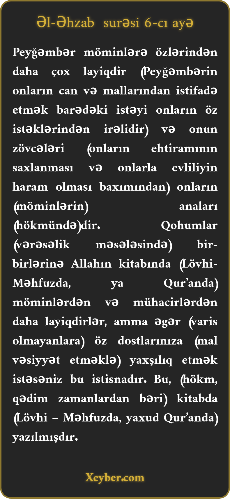 Peyğəmbər möminlərə özlərindən daha çox layiqdir (Peyğəmbərin onların can və mallarından istifadə etmək barədəki istəyi onların öz istəklərindən irəlidir) və onun zövcələri (onların ehtiramının saxlanması və onlarla evliliyin haram olması baxımından) onların (möminlərin) anaları (hökmündə)dir. Qohumlar (vərəsəlik məsələsində) bir-birlərinə Allahın kitabında (Lövhi-Məhfuzda, ya Qur’anda) möminlərdən və mühacirlərdən daha layiqdirlər, amma əgər (varis olmayanlara) öz dostlarınıza (mal vəsiyyət etməklə) yaxşılıq etmək istəsəniz bu istisnadır. Bu, (hökm, qədim zamanlardan bəri) kitabda (Lövhi – Məhfuzda, yaxud Qur’anda) yazılmışdır.