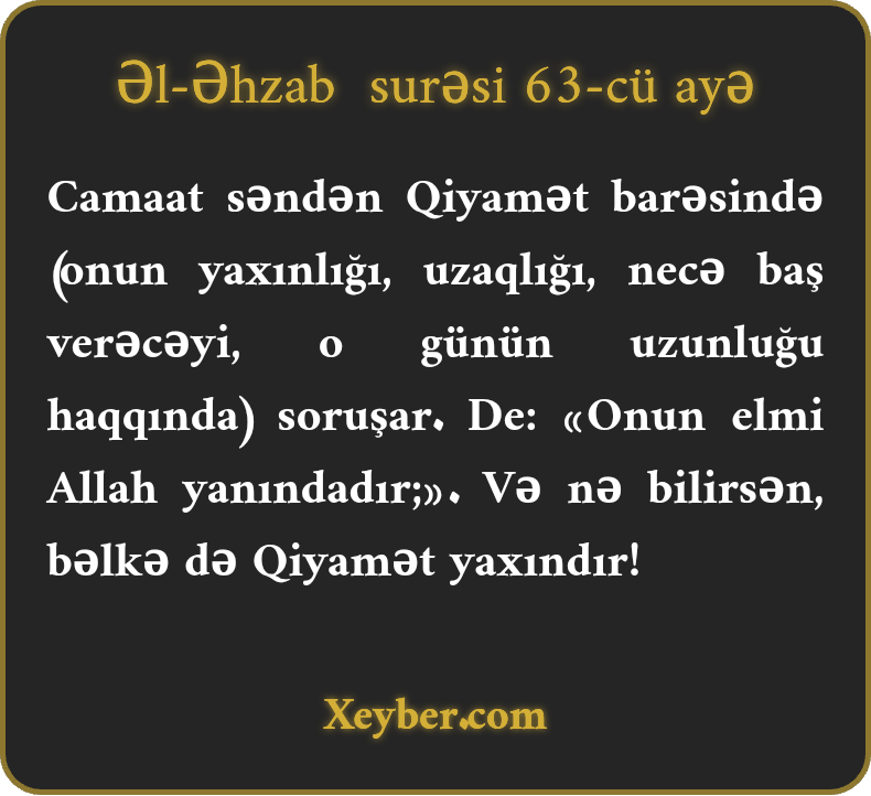 Camaat səndən Qiyamət barəsində (onun yaxınlığı, uzaqlığı, necə baş verəcəyi, o günün uzunluğu haqqında) soruşar. De: «Onun elmi Allah yanındadır;». Və nə bilirsən, bəlkə də Qiyamət yaxındır!