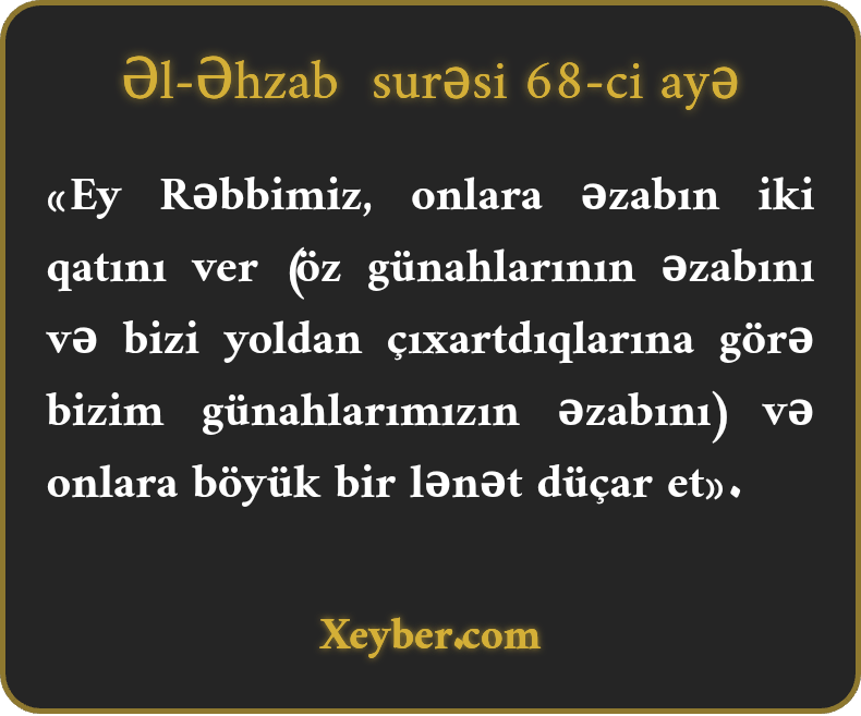 «Ey Rəbbimiz, onlara əzabın iki qatını ver (öz günahlarının əzabını və bizi yoldan çıxartdıqlarına görə bizim günahlarımızın əzabını) və onlara böyük bir lənət düçar et».