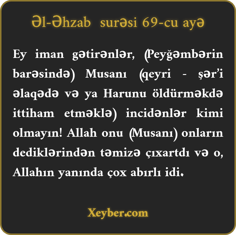Ey iman gətirənlər, (Peyğəmbərin barəsində) Musanı (qeyri - şər’i əlaqədə və ya Harunu öldürməkdə ittiham etməklə) incidənlər kimi olmayın! Allah onu (Musanı) onların dediklərindən təmizə çıxartdı və o, Allahın yanında çox abırlı idi.