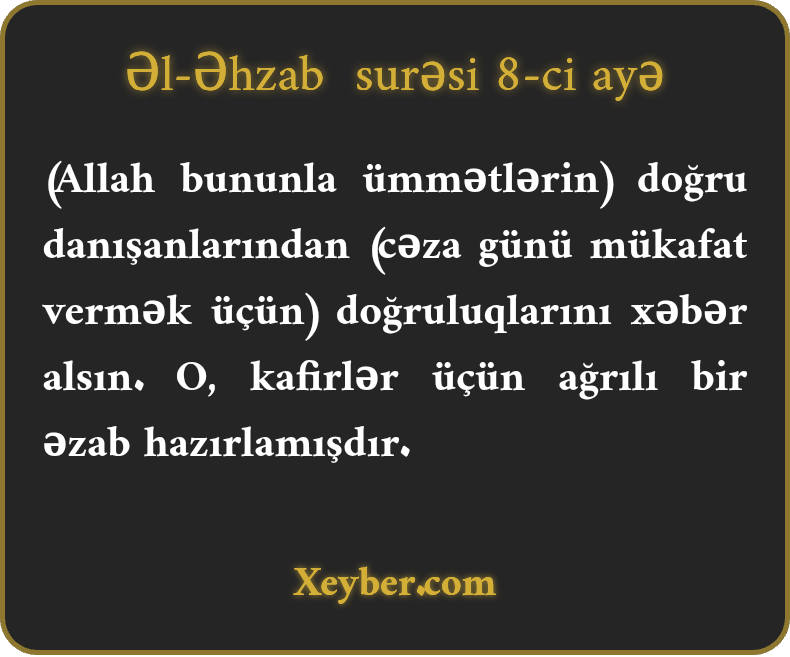 (Allah bununla ümmətlərin) doğru danışanlarından (cəza günü mükafat vermək üçün) doğruluqlarını xəbər alsın. O, kafirlər üçün ağrılı bir əzab hazırlamışdır.