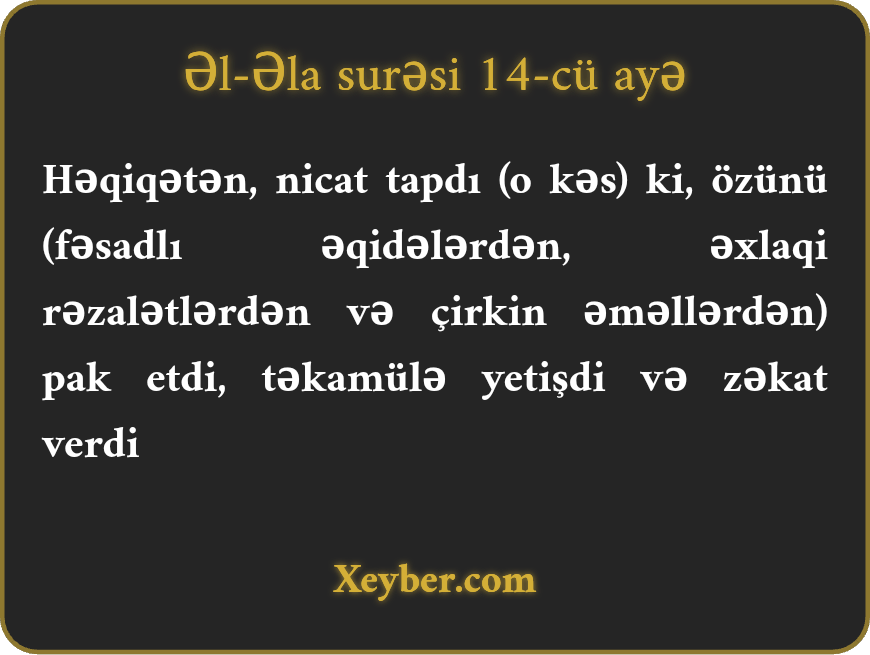 Həqiqətən, nicat tapdı (o kəs) ki, özünü (fəsadlı əqidələrdən, əxlaqi rəzalətlərdən və çirkin əməllərdən) pak etdi, təkamülə yetişdi və zəkat verdi