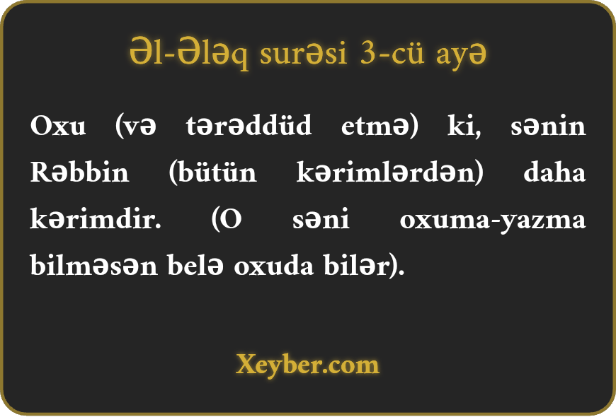Oxu (və tərəddüd etmə) ki, sənin Rəbbin (bütün kərimlərdən) daha kərimdir. (O səni oxuma-yazma bilməsən belə oxuda bilər).