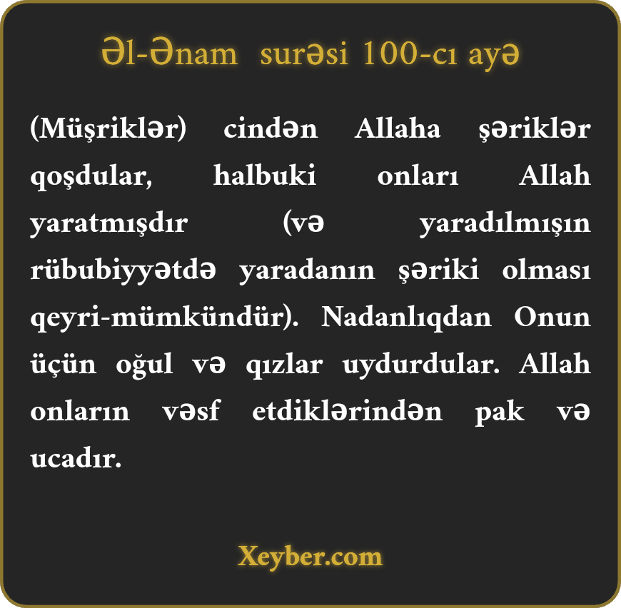 "Onlar Allaha cinlərdən şəriklər qərar verdilər. Halbuki onları da Allah yaratmışdı. Nadanlıq səbəbindən Allah üçün oğlanlar və qızlar uydurdular. Allah onların vəsflərindən üstün və pakdır.”