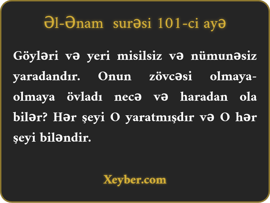 "O, göyləri və yeri yaradandır. Onun üçün yoldaş olmadığı halda övladı necə ola bilər?! O hər şeyi yaratmış və hər şeyi biləndir.”