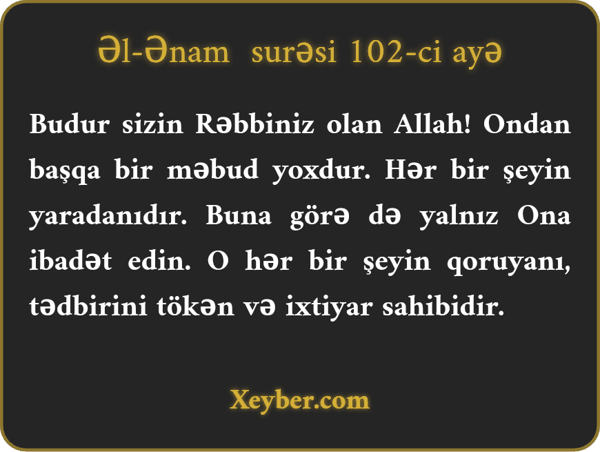 "Odur Allah, sizin Rəbbiniz. Ondan başqa məbud yoxdur. O hər şeyin yaradıcısıdır. Beləcə, Ona pərəstiş edin. O hər şeyin vəkilidir.”
