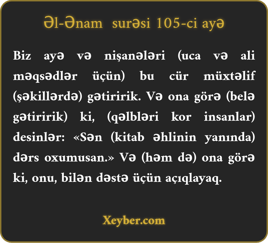 "Beləcə, ayələri müxtəlif şəkildə bəyan edirik (ki, hidayət vasitəsi olsun. Amma iman gətirməyib) deyirlər: "Sən (kiminsə yanında) dərs oxumusan! (Qoy desinlər. Amma Biz) Düşüncə və elm əhli olanlar üçün bəyan edirik.”