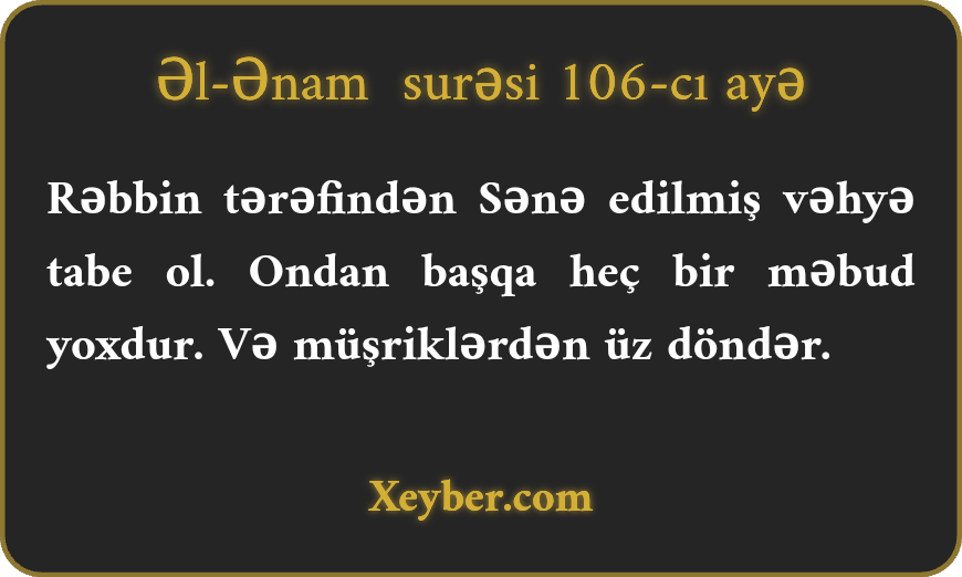 "Yalnız Rəbbin tərəfindən sənə vəhy edilənə tabe ol. Ondan başqa məbud yoxdur və müşriklərdən üz döndər.”