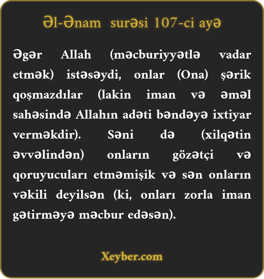 "Əgər Allah istəyərdisə (hamı məcburi iman gətirərdi və) şirkə uğramazdı. (Amma ilahi sünnə, qanun belə deyildir.) Biz səni onlara nəzarətçi qərar vermədik və sən onlara (onların iman gətirməsinə) vəkil deyilsən.”