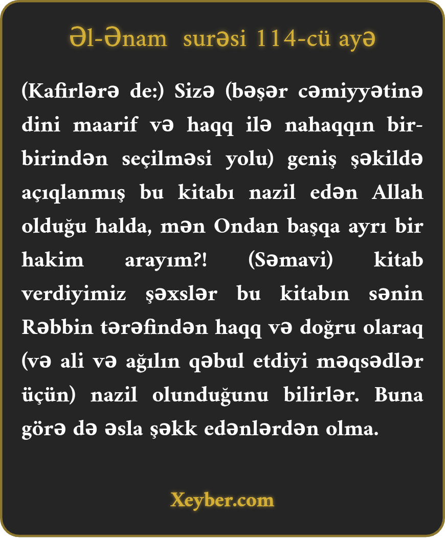 "(De ki, bir bu qədər aşkar dəlillə) Allahdan qeyrisinimi hakim seçim? Halbuki sizə doğru səmavi kitabı müfəssəl şəkildə nazil edən Odur. Kitab verdiyimiz kəslər (yəhudi və məsihilər) bilirlər ki, bu kitab sənin Rəbbin tərəfindən haqq olaraq nazil olmuşdur. Heç vaxt tərəddüd edənlərdən olma.”