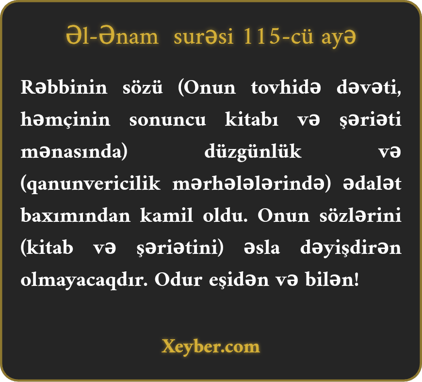 "Rəbbinin kəlamı sədaqət və ədalətlə kamal və tamlıq həddinə çatdı. Onun kəlmələrini dəyişəcək kimsə yoxdur və O eşidən, biləndir.”