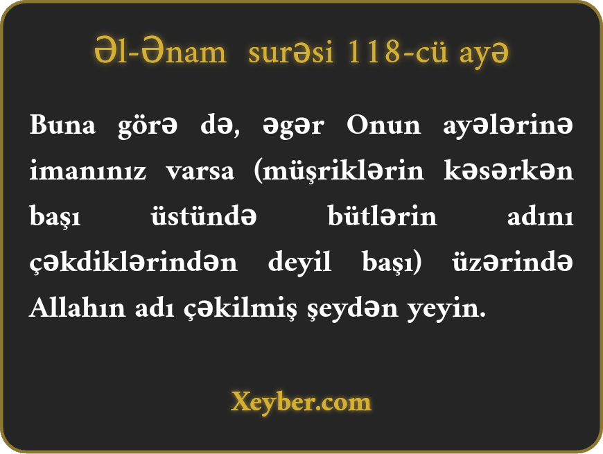 "Əgər ilahi ayələrə imanınız varsa yalnız (zibh zamanı) Allahın adı çəkiləndən yeyin.”