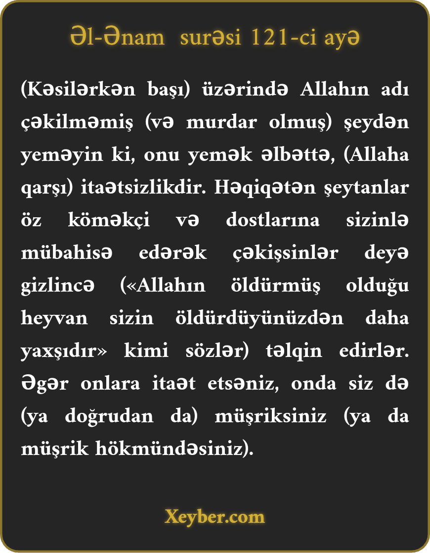 "Allah adı çəkilməyən şeylərdən yeməyin. Çünki onu yemək (bəndəlik dairəsindən çıxmaq,) həddi aşmaqdır. Həqiqətən, şeytanlar öz dostlarına təlqin edirlər ki, sizinlə höcətləşməyə qalxsınlar. (Məsələn, deyirlər ki, ölü heyvanla kəsilmiş heyvan arasında nə fərq var ki?!) Əgər onlara itaət etsəniz, şübhəsiz, siz də müşrik olarsınız.”