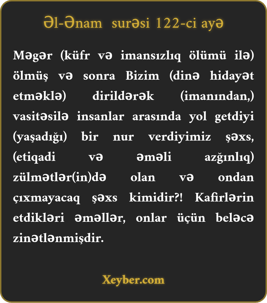 "(Cəhl və şirk vasitəsi ilə) öldüyü halda öz hidayətimizlə həyat bəxş etdiyimiz, xalq arasında yolunu tapa bilməsi üçün bir nur qərar verdiyimiz kəs, (cəhl və şirk) zülmətlərində qərar tutub qurtula bilməyən kəs kimi ola bilərmi? Beləcə, kafirlər üçün etdikləri işlər zinətləndirilmişdir.”