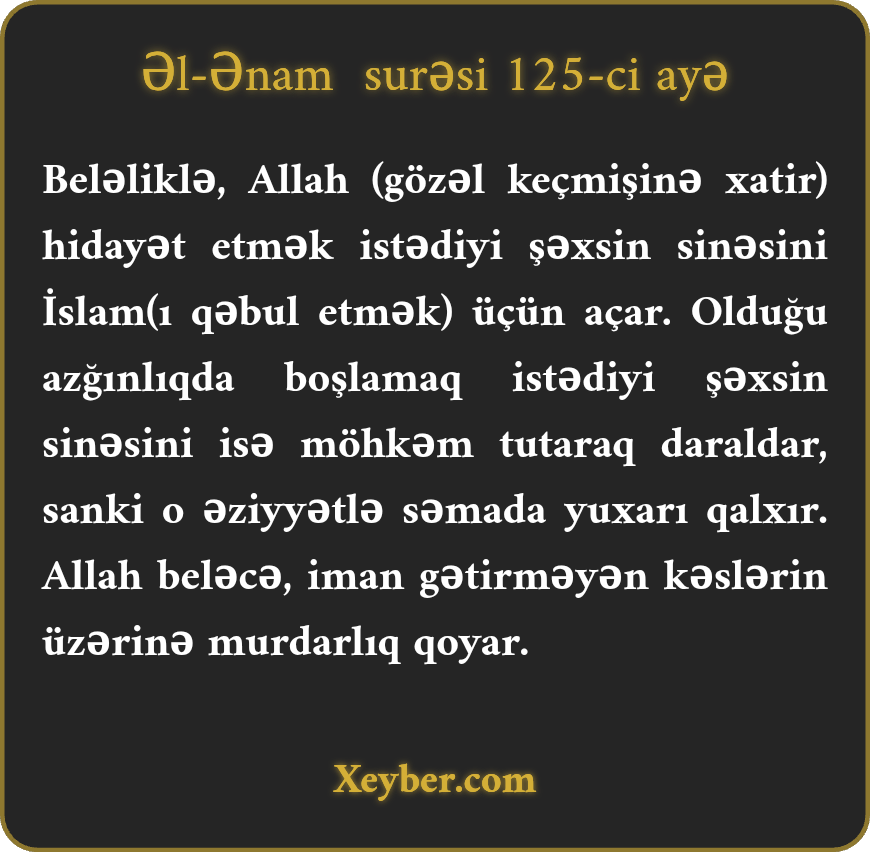 "Allah hidayət etmək istədiyi kəsin sinəsini İslam (İslam qəbulu) üçün genişləndirər. Hər kəsi (alçaq xislətinə görə) azdırmaq istəsə, sinəsini (iman üçün) bərkidir. O, sanki əzab-əziyyətlə göyə qalxar. Allah bu sayaq çirkinliyi iman gətirməyənlər üçün qərar verir.”
