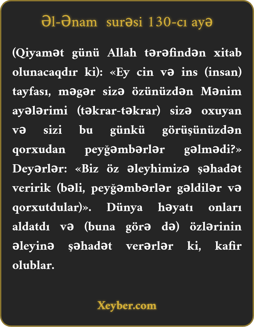 "(Qiyamətdə onlara deyilər:) «Ey cin və ins (insan) qövmü! Ayələrimizi sizə oxumaq və sizi bu günkü görüşlə qorxutmaq üçün özünüzdən olan peyğəmbərlər göndərmədikmi?» Deyərlər: "Biz özümüzə qarşı şəhadət veririk.” Dünya həyatı onları aldatdı və özlərinə şahid durdular ki, kafir olmuşlar.”