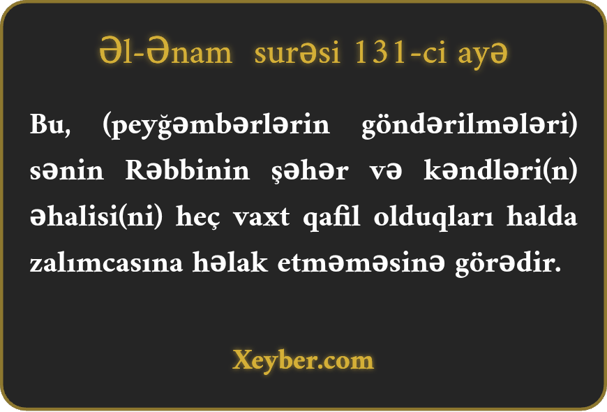 "Bu, (höccətin tamamlanması və xəbərdarlıq) onun üçündür ki, sənin Rəbbin heç vaxt zülm olaraq əhalisi qəflətdə olan abadlıqları məhv etmir. (Allah əvvəlcə xalqı qəflət və cəhalət girdabından çıxarır, peyğəmbərlərin vasitəsi ilə onlara xəbərdarlıq edir, sonra qəbul etməyənləri cəzalandırır).”