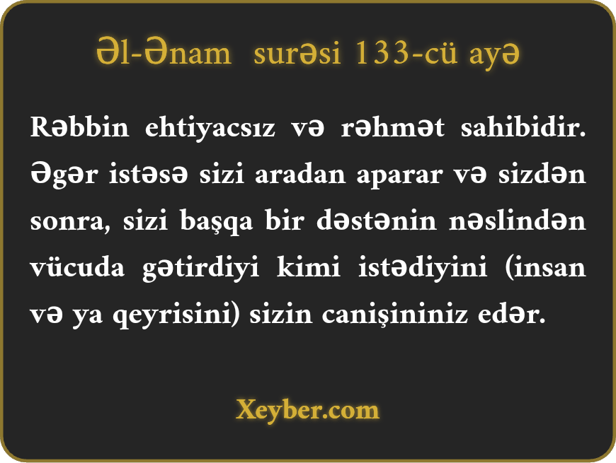 "Sənin Rəbbin ehtiyacsızdır və rəhmət sahibidir. Əgər istəsə, sizi aparar və sizdən sonra istədiyini gətirər. Necə ki, sizi digər bir qövmün nəslindən yaratdı.”