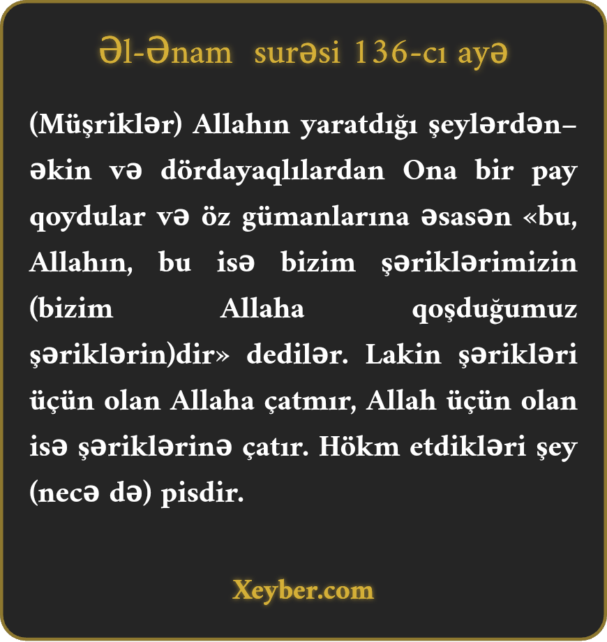 "(Bütpərəstlər) Allahın yaratdığı əkin və mal-qaradan Allah üçün pay ayırırdılar və öz gümanlarına əsasən deyirdilər: "Bu, Allahın payıdır, bu isə bizim şəriklərimizin (bütlərin). Şəriklərə və bütlərə ayrılmış paydan Allaha çatmır. Amma Allahın nə payı varsa şəriklərə ondan çatır.” Necə də pisdir onların mühakimələri!”