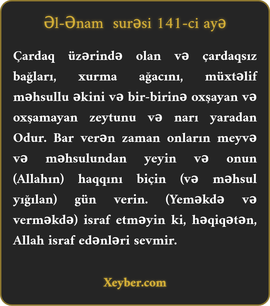 "Dayaqlı və dayaqsız bağları, xurma ağaclarını, müxtəlif qidaları olan əkinləri, bəziləri oxşar, bəziləri oxşar olmayan zeytun və narı vücuda gətirən kəs Odur. Bağlar səmərə verən kimi meyvəsindən yeyin, yığım günü (məhrumlara) onun haqqını verin və israf etməyin. Çünki Allah israf edənləri sevməz.”