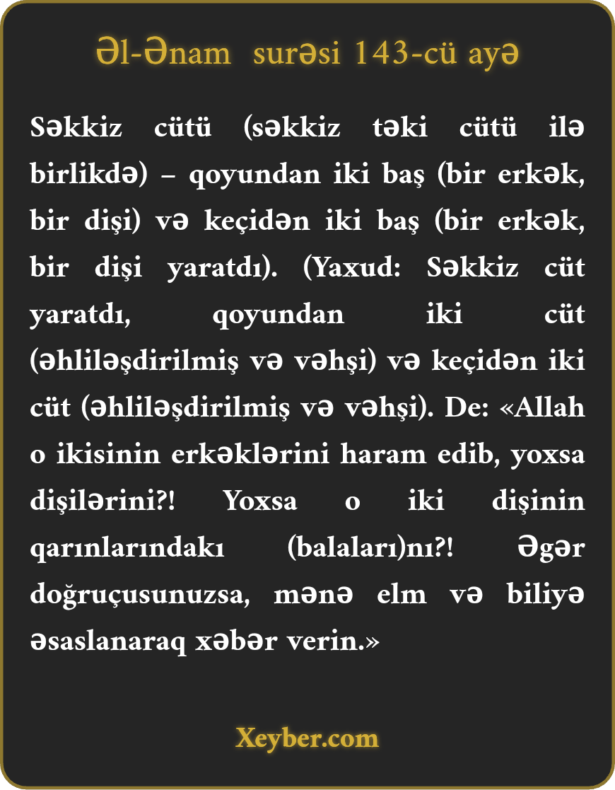 "Allah (o heyvanlardan) səkkiz cift yaratdı: (erkək və dişi olmaq üzrə bir cüt qoyun və bir cüt keçi). De ki: «Allah iki erkəyi, yoxsa iki dişini, yaxud da iki (müxtəlif cinsli) dişinin qarınlarındakı balaları haram etdi? Əgər (Allahın nəyi halal, nəyi haram buyurduğu barədəki) iddialarınız doğrudursa, bir biliyə əsaslanaraq (bu haqda) mənə xəbər verin!»”