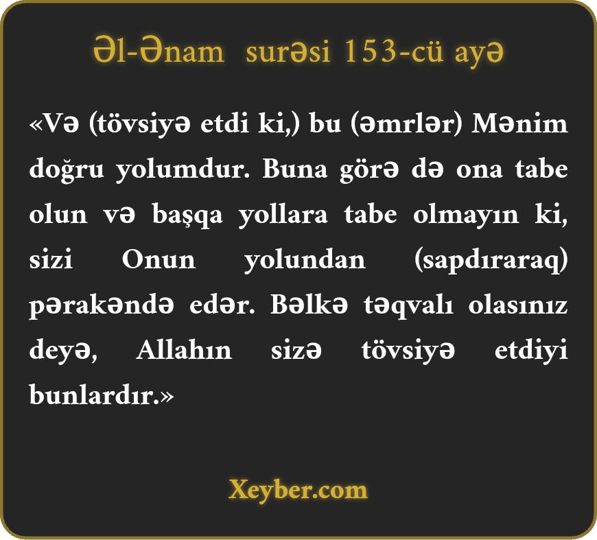 "Bu (göstərişlər) Mənim doğru yolumdur. Ona tabe olun və başqalarının yolunu getməyin ki, sizi Allahın yolundan kənar salsınlar. Bu, Allahın sizə sifarişidir. Bəlkə təqva yolunu tutasınız.”