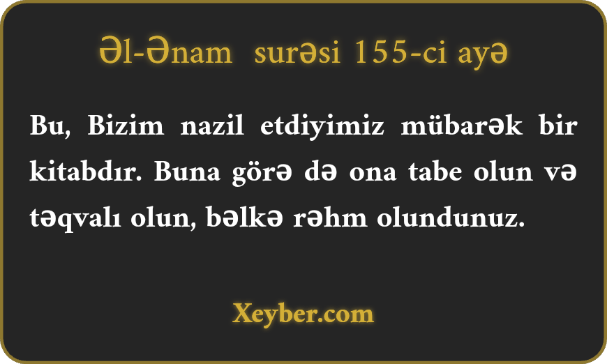 "Bu (Quran) mübarək bir kitabdır ki, onu nazil etdik. Ona tabe olub təqva yolunu seçin. Bəlkə rəhmətə çatasınız.”