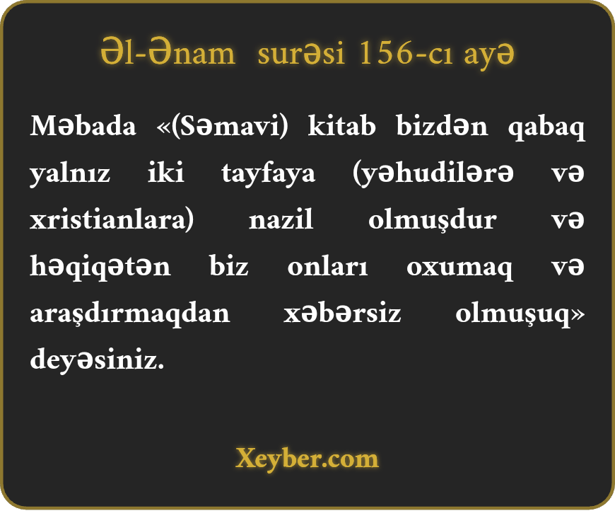 "(Biz onu nazil etdik ki,) deməyəsiniz: səmavi kitab yalnız bizdən əvvəl olmuş iki tayfaya (yəhudi və məsihilərə) nazil olmuşdur və biz onların elmindən xəbərsiz qalmışıq.”