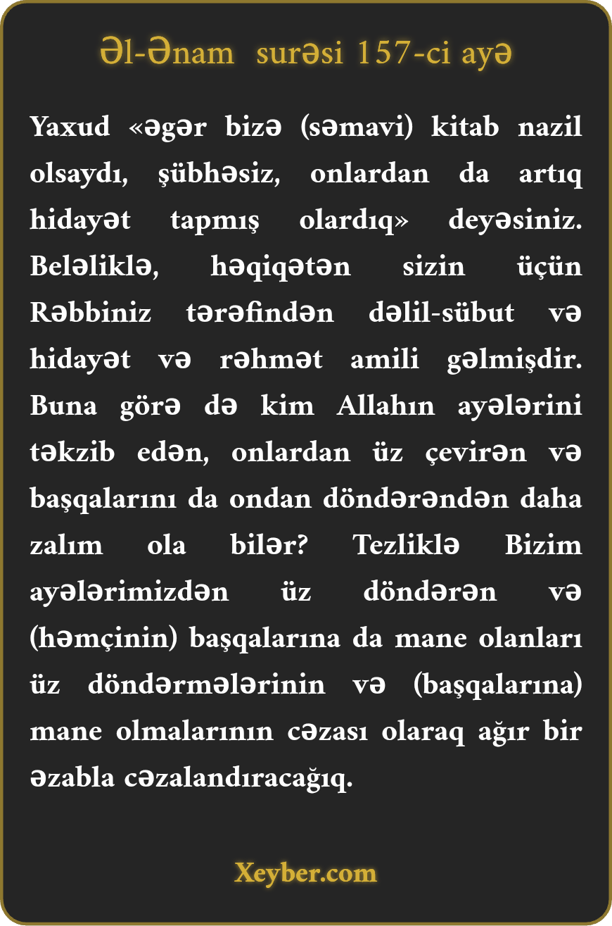 "(Kitabı nazil etdik ki), "əgər səmavi kitab nazil olsaydı, hökmən onlardan (yəhudi və məsihilərdən) daha çox hidayət olardıq” deməyəsiniz. (Bu bəhanələrin qarşısını almaq üçün) şübhəsiz, Rəbbiniz tərəfindən aşkar dəlil, hidayət və rəhmət gəldi. İlahi ayələri təkzib edib ondan üz çevirənlərdən zalımı kimdir? Biz tezliklə ayələrimizdən üz çevirənləri həmin dönüklüklərinə görə ağır əzabla cəzalandıracağıq.”