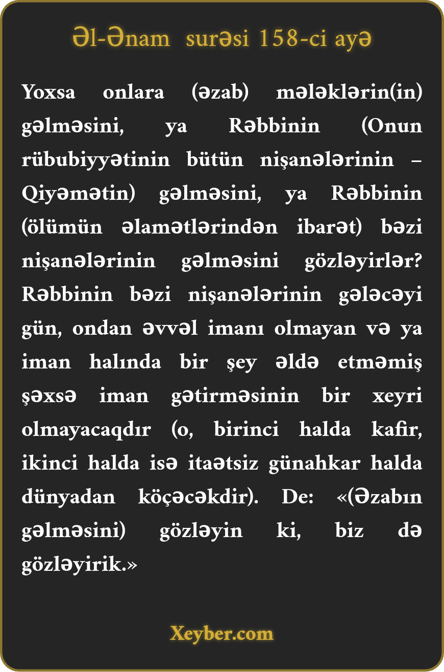 "Məgər bundan sonra da gözləyirlərmi ki, onların yanına mələklər, Rəblərinin özü, Rəblərinin bəzi ayələri gəlsin?! (Məgər bilmirlərmi,) o gün ki, Rəblərinin bəzi nişanələri gələcək, bundan qabaq iman gətirməyən və ya iman gətirdiyi müddətdə xeyir iş görməyən şəxs iman gətirsə də, faydasız olar?! De ki, (Allahın qəzəbi) intizarında olun ki, biz də intizardayıq.”