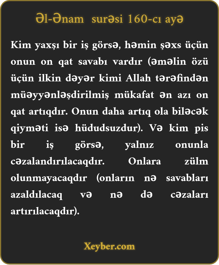 "Hər kəs yaxşılıq gətirsə, onun üçün (gətirdiyinin) on qat əvəzi var. Hər kəs pislik gətirsə, həmin qədər cəza görəcək. Onlara heç vaxt zülm olunmayacaq.”