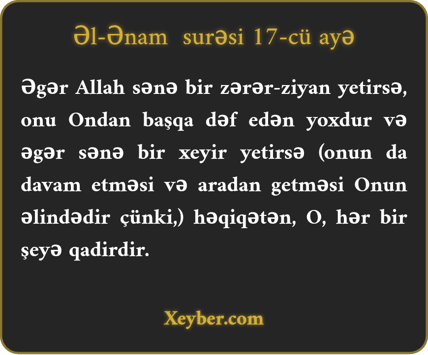 "Əgər Allah (sınaq, inkişaf və ya əməllərinin cəzası üçün) səni zərər-ziyanla üzləşdirsə, Özündən savay kimsə onu aradan qaldıra bilməz. Əgər sənə bir xeyir yetişsə, Onun hər şeyə gücü çatar.”