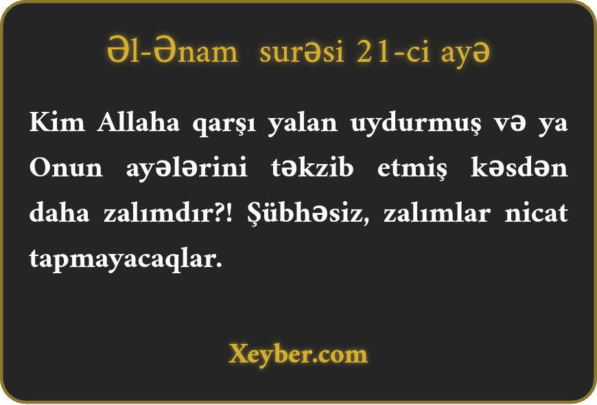"Allaha iftira yaxan və ilahi ayələri təkzib edəndən də zalım olan kimdir? Həqiqətən, zalımlar nicat tapmazlar.”