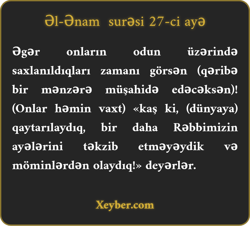 "Əgər onları od ağzında saxlanılan vaxt görsəydin, (eşidərdin ki,) deyirlər: "Kaş ki, yenidən dünyaya qaytarılaydıq, Rəbbimizin ayələrini təkzib etməyəydik və möminlərdən olaydıq.”