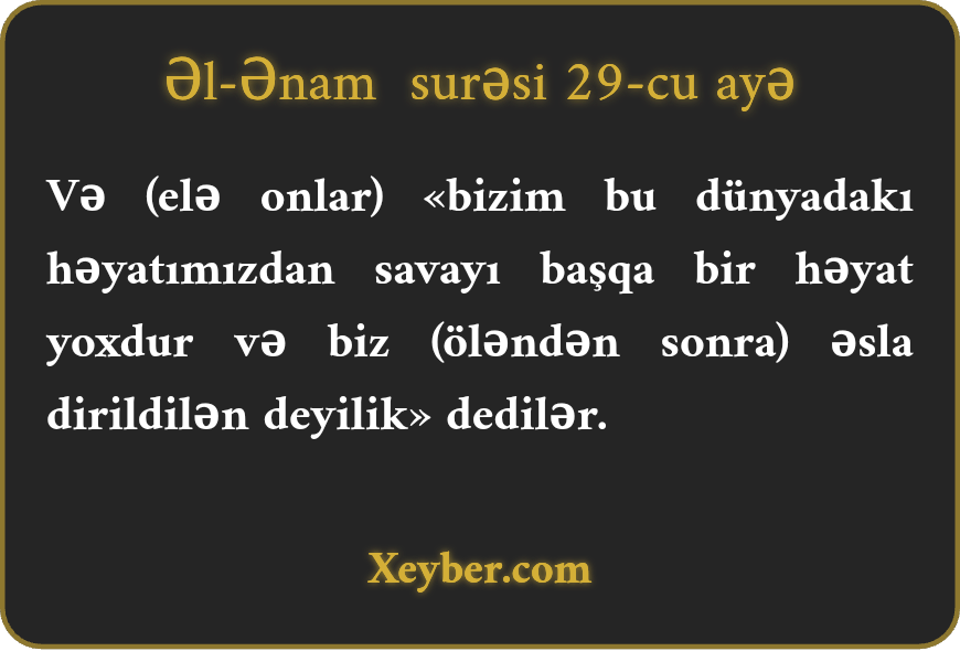 "Onlar dedilər: "Bizim dünya həyatımızdan başqa heç bir həyat yoxdur və biz (öləndən sonra) dirildilməyəcəyik.”