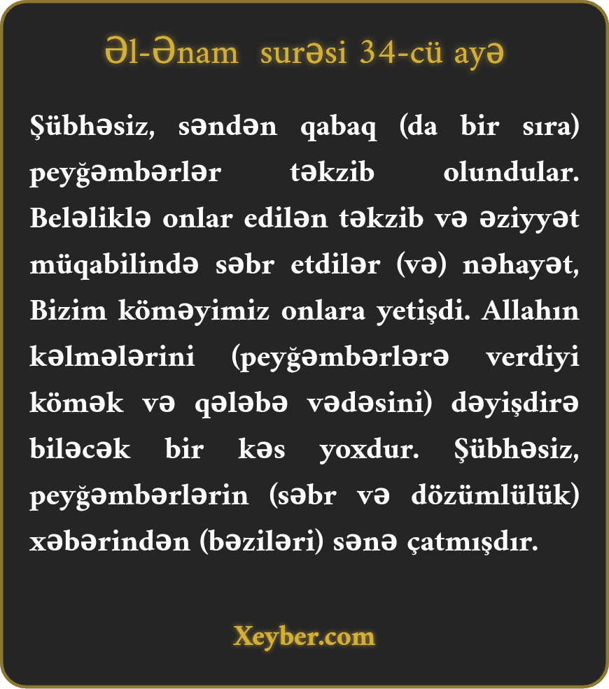 "Həqiqətən, səndən qabaq da peyğəmbərlər təkzib olundular. Amma onlar bu təkzib və əzab-əziyyət qarşısında səbir etdilər. Nəhayət, Bizim yardımımız onlara çatdı. (Sən də belə ol, çünki) Allahın kəlmələrini (sünnələrini) dəyişən yoxdur. Şübhəsiz, peyğəmbərlərin xəbərlərindən sənin üçün gəlmişdir. (Onların tarixi ilə tanışsan.)”