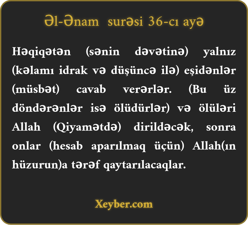 "(Sənin dəvətini) yalnız eşidən qulağı olanlar qəbul edər. (Yaxınlaşmayan kafirlər) Qiyamət günü Allahın ayağa qaldıracağı və hamısı Ona doğru qaytarılacaq ölülərdir.”