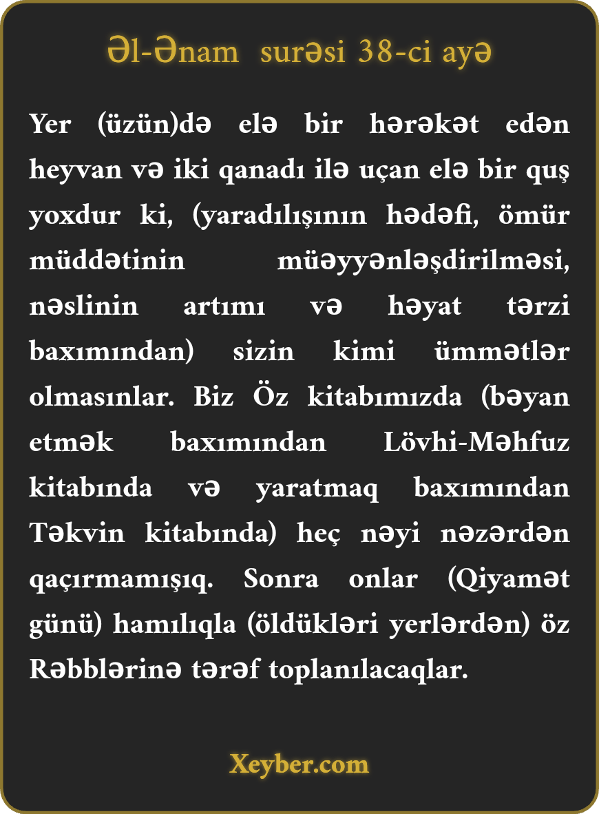"Yerdə heç bir canlı, iki qanadı ilə uçan heç bir quş yoxdur ki, onlar da sizin kimi ümmətlər olmasın. Biz bu kitabda (Quran və ya Lövhi-məhfuzda) heç nəyi ötürmədik. Sonra hamı öz Rəbbinin yanında toplanar.”