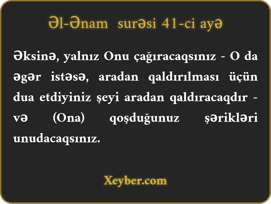 "Əksinə, (təhlükə zamanı) yalnız Onu çağırarsınız. Əgər istəsə, Allah Onu çağırmağınıza səbəb olan çətinliyi aradan qaldırar. Allaha şərik güman etdiklərinizi (qiyamət günü) unudarsınız.”