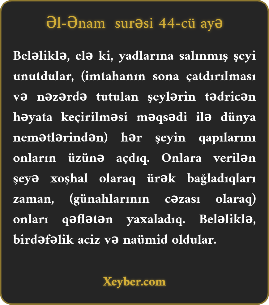 "Onlara verilmiş nəsihətləri unutduqlarından hər növ nemət qapılarını üzlərinə açdıq. (Maddi nemətlər içində qərq oldular.) Onlara veriləndən məmnun olduqları vaxt qəfildən onları saxladıq və birdəfəyə qəmgin və ümidsiz oldular.”