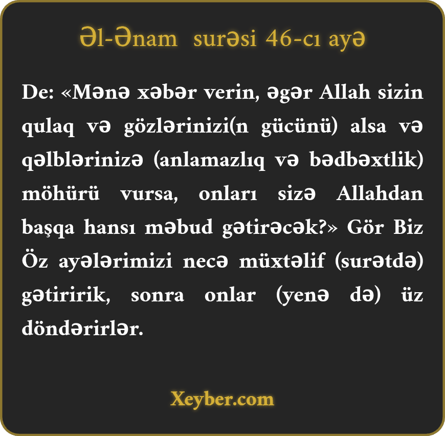 "De ki, nə düşünürsünüz, əgər Allah sizin eşitmə və görmənizi alsa və qəlblərinizə möhür vursa, Ondan başqa hansı məbud bunları sizin üçün aça bilər? Gör ki, Biz ayələri müxtəlif şəkillərdə necə bəyan edirik. Amma onlar (iman gətirib təslim olmaq əvəzinə) üz döndərirlər.”