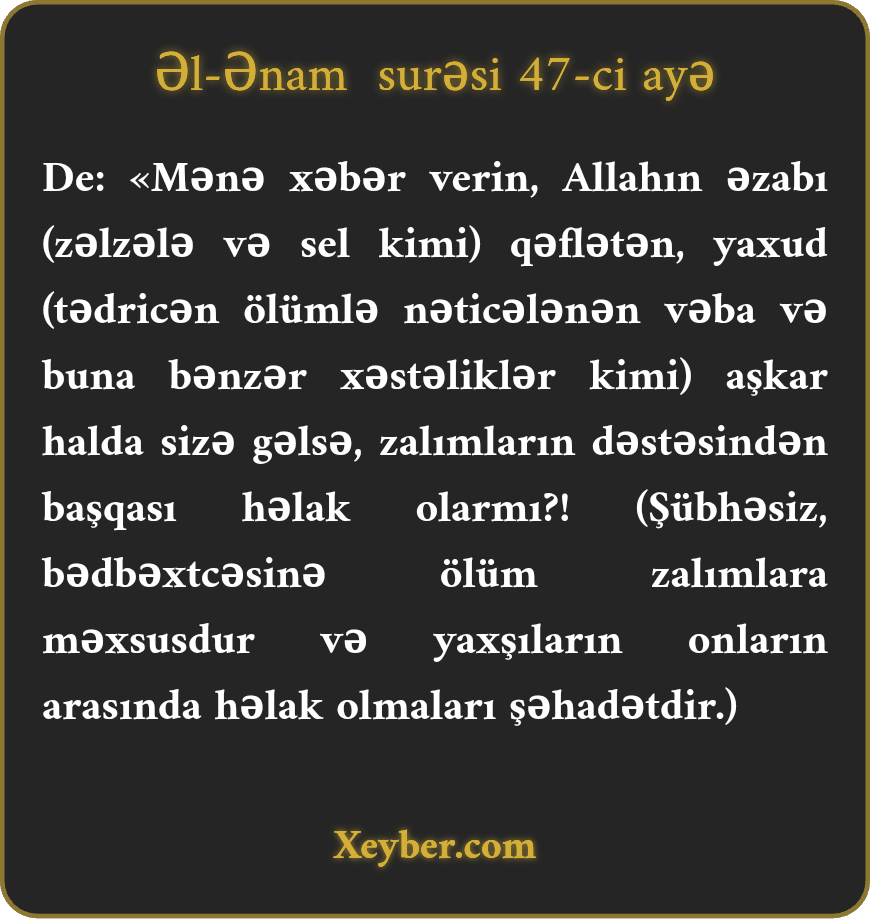 "De ki, əgər Allahın əzabı gizli və ya aşkar şəkildə sorağınıza gəlsə (nə edəcəksiniz?) Məgər zalım qövmlərdən qeyrisimi həlak olar?”
