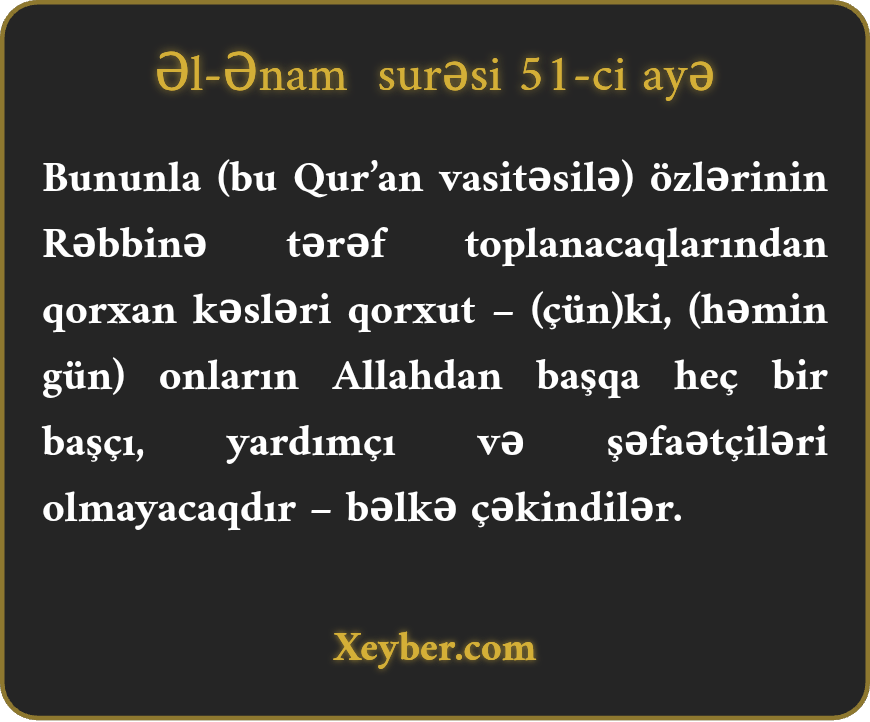 "Onun (Quranın) vasitəsi ilə Allahın hüzurunda məhşur olacağından (dayanacağından) qorxan kəslərə xəbərdarlıq et. (Çünki) onlar üçün Allahdan qeyri yardımçı və şəfaətçi yoxdur. Bəlkə çəkinələr.”