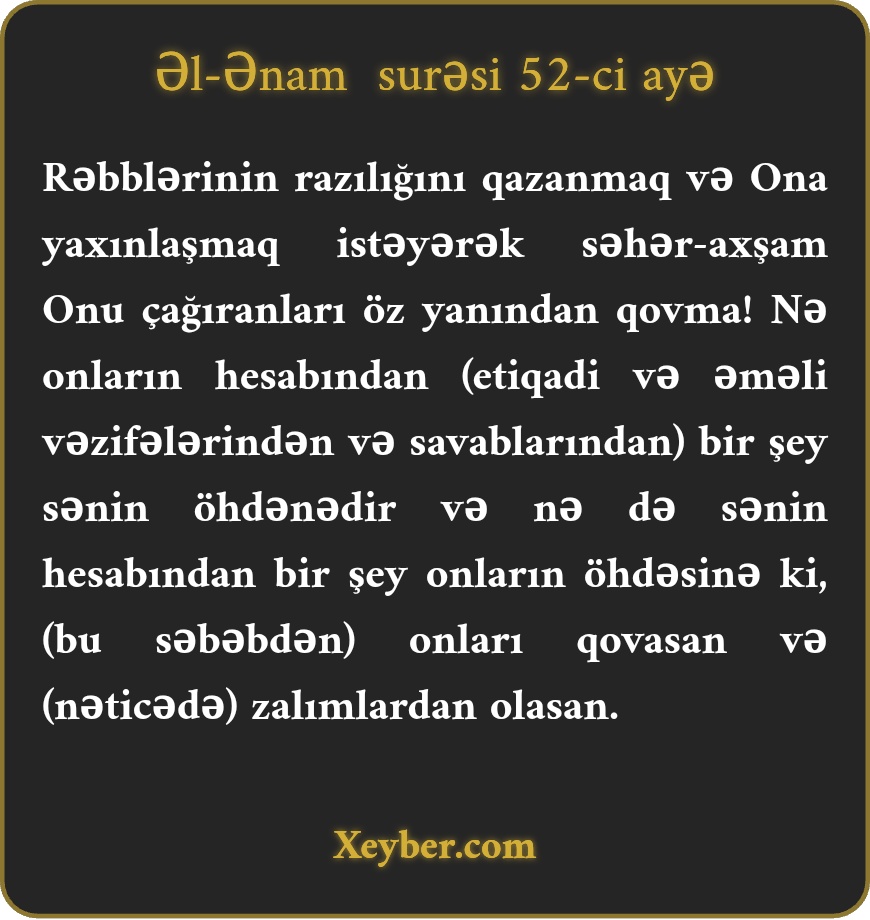 "Sübh və axşam Allahın razılığını istəyən halda Rəblərini çağıran kəsləri özündən kənarlaşdırma. Onların hesabından sənin öhdəndə, sənin hesabından onların öhdəsində bir şey yoxdur ki, onları rədd edib nəticədə zalımlardan olasan.”
