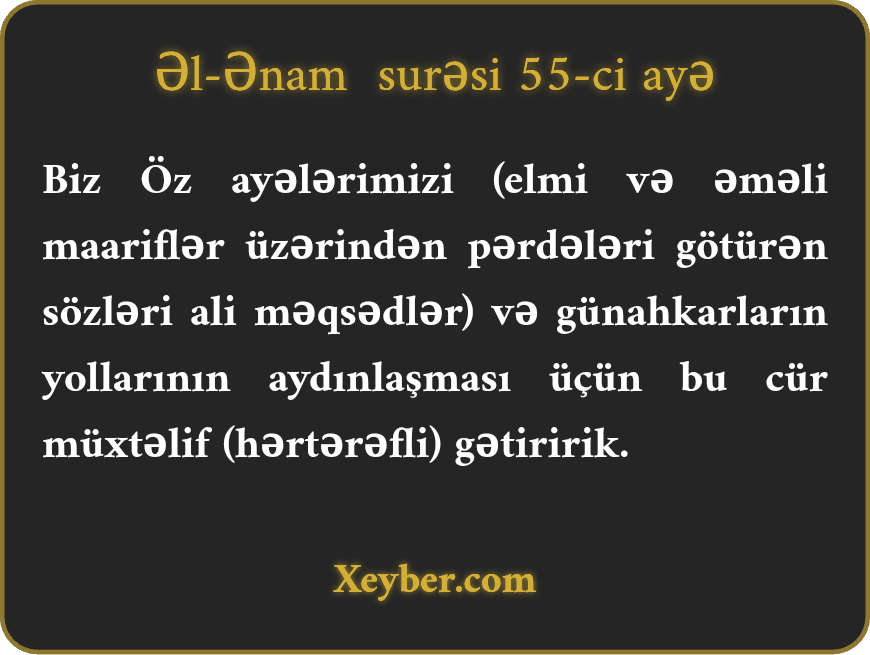 "Biz beləcə ayələri (xalq üçün) açıq-aydın bəyan edirik (ki, haqq aşkar,) günahkarların yolu və qaydası aydın olsun.”